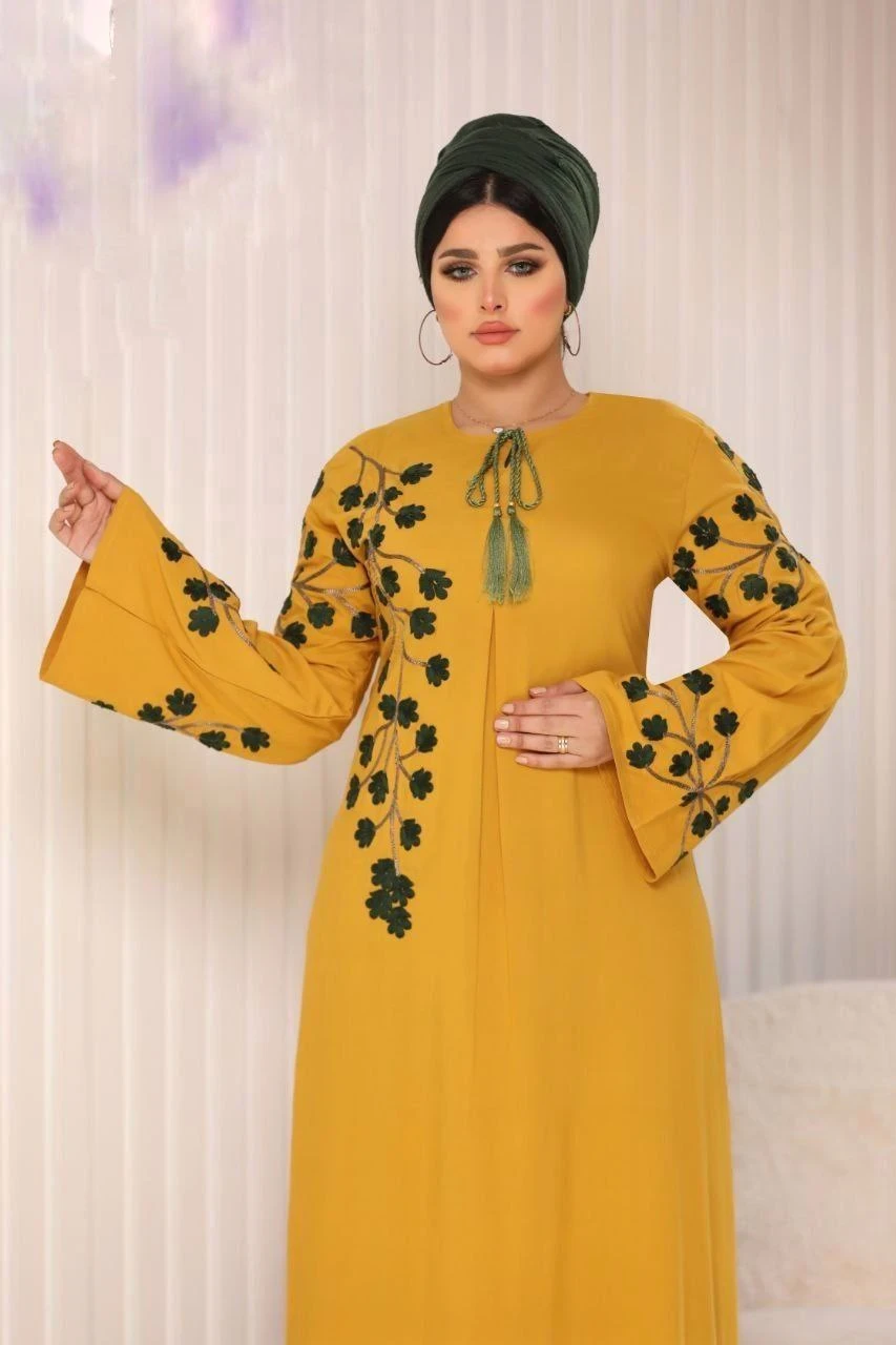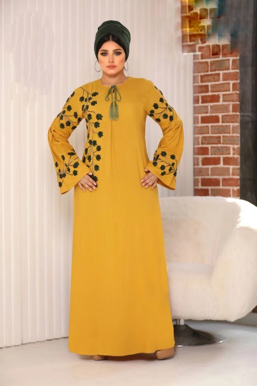 جلابية استقبال بتطريز ورده لون زيتي على الصدر والاكمام والخلف